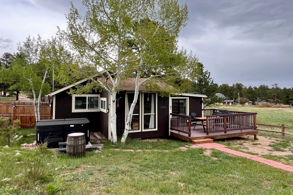 2 Bedrooms • 1 Bathroom 1 Bath • Sleeps 3-5Location, wildlife, views, and a brand new hot tub (Permit No. 22-RES0263). What more can you want in mountain cabin escape to Estes Park. This is the perfect medium sized home for a small family, group of friends, or romantic getaway. It has two bedrooms – one with a queen bed and the second with a double and twin bed, all with recently replaced mattresses and new wood paneling on the walls. Vaulted ceilings and large windows in the living room allow for lots of light and a scenic view. Beautifully updated kitchen, separate dining area and wood burning fireplace make this vacation rental a great choice. It has a Smart TV and sleeps up to 5.