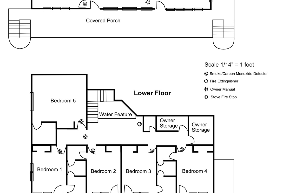 Walk downstairs beside the waterfall, then take your pick from multiple bedrooms with king beds that each have private access to the back porch. All of them share the view of the mountains. There are 2 jack-and-jill baths, so each bedroom has its own sink/toilet and shares a tub/shower.