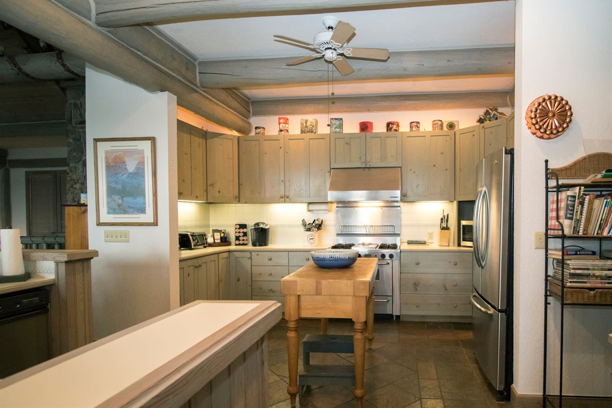 KITCHEN has it all: Gas range. New dishwasher. Large fridge. Lots of counter space. Big island. Large pantry....Everything you need to cook and enjoy a big family meal. Well-stocked Safeway in town.
